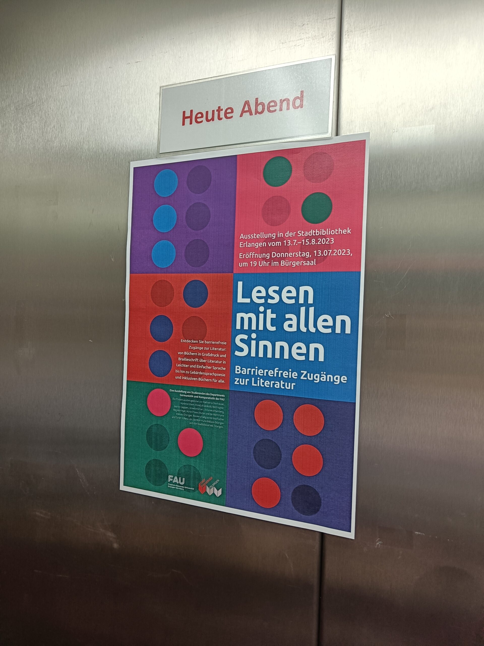 Literatur ist für alle da! Also sollte Literatur auch so barrierefrei wie möglich dargeboten werden, so dass sie möglichst allen Menschen zugänglich ist und niemanden ausschließt. Geht das überhaupt? Aber ja: Es gibt viele barrierearme Kommunikationsangebote und es werden immer mehr. Die von Germanistik-Studierenden gestaltete Ausstellung zu Literatur und Barrierefreiheit in der Stadtbibliothek Erlangen gibt einen Überblick über unterstützte Kommunikationsangebote und Vermittlungsformen, die auf die speziellen Bedarfe reagieren, die im Umgang mit Literatur auftreten können.
