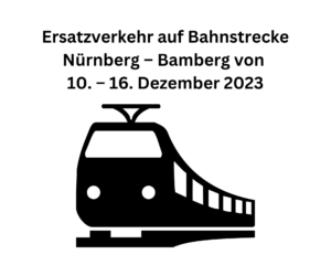 Aufgrund von Bauarbeiten wird der Zugverkehr zwischen Nürnberg und Bamberg vom Sonntag, 10. Dezember, bis einschließlich Samstag, 16. Dezember, eingestellt. Ein Schienenersatzverkehr im Regional- und S-Bahnverkehr wird eingerichtet. Die Verbindungen sind über die Fahrplanauskunft auf www.bahn.de bereits abrufbar.