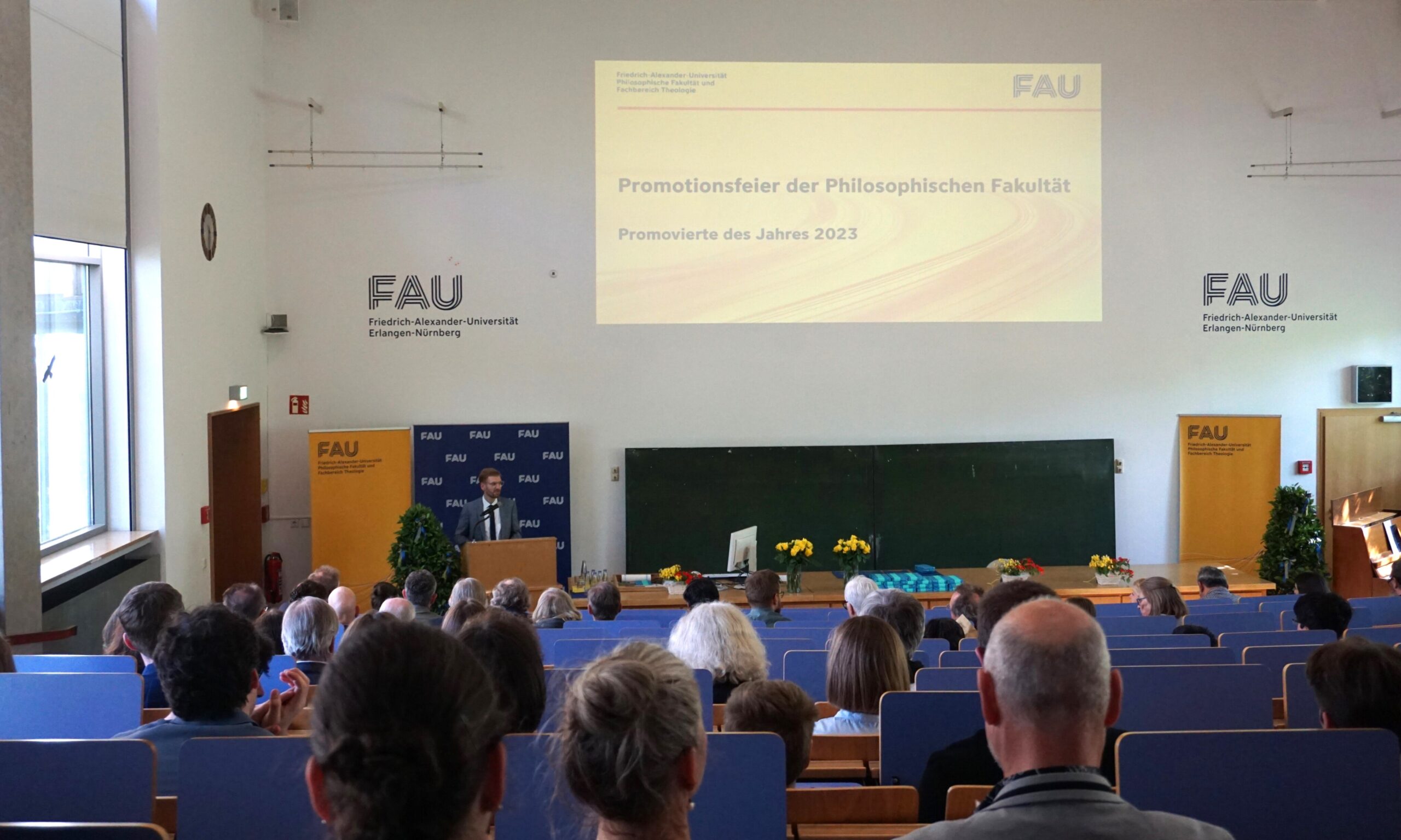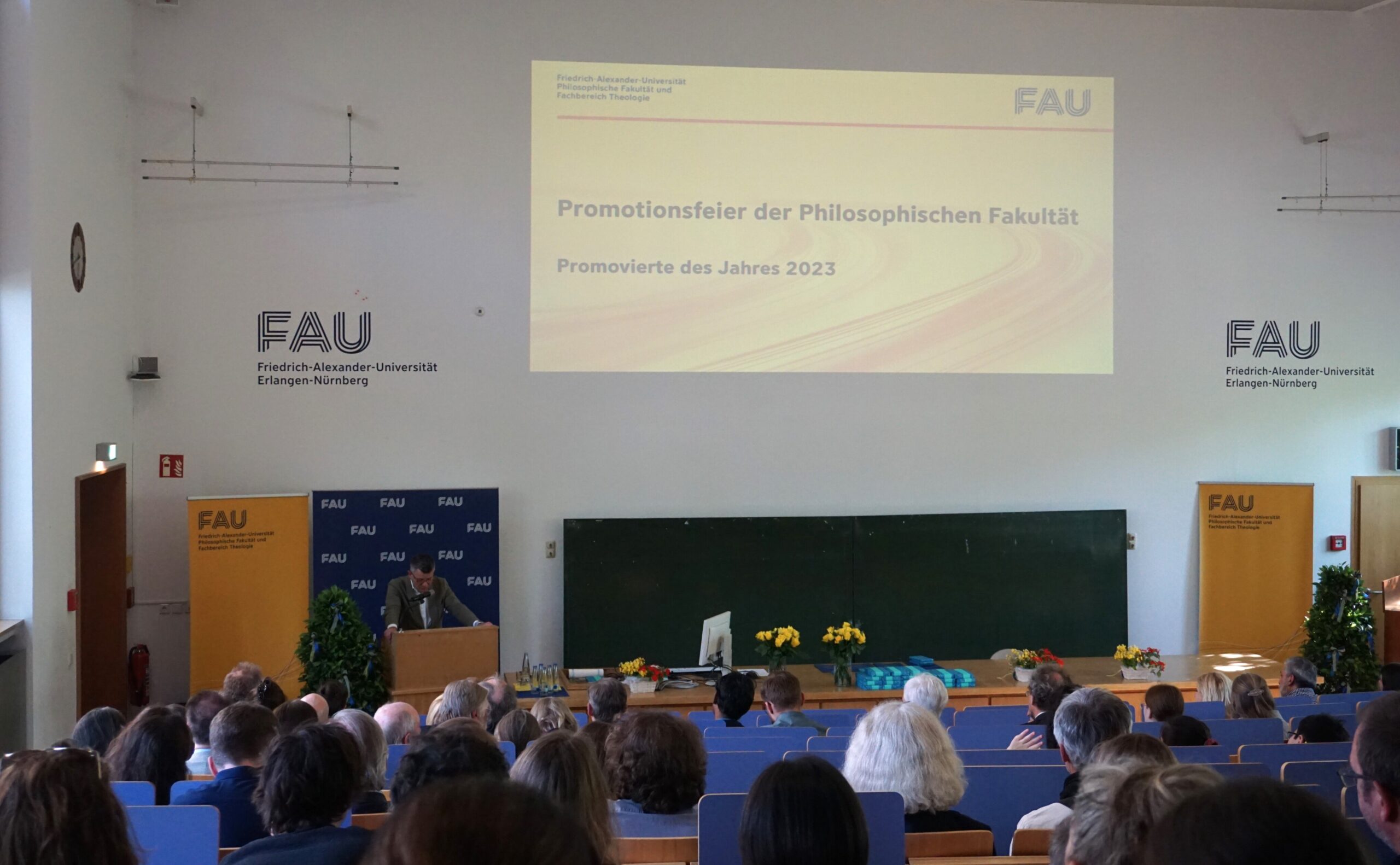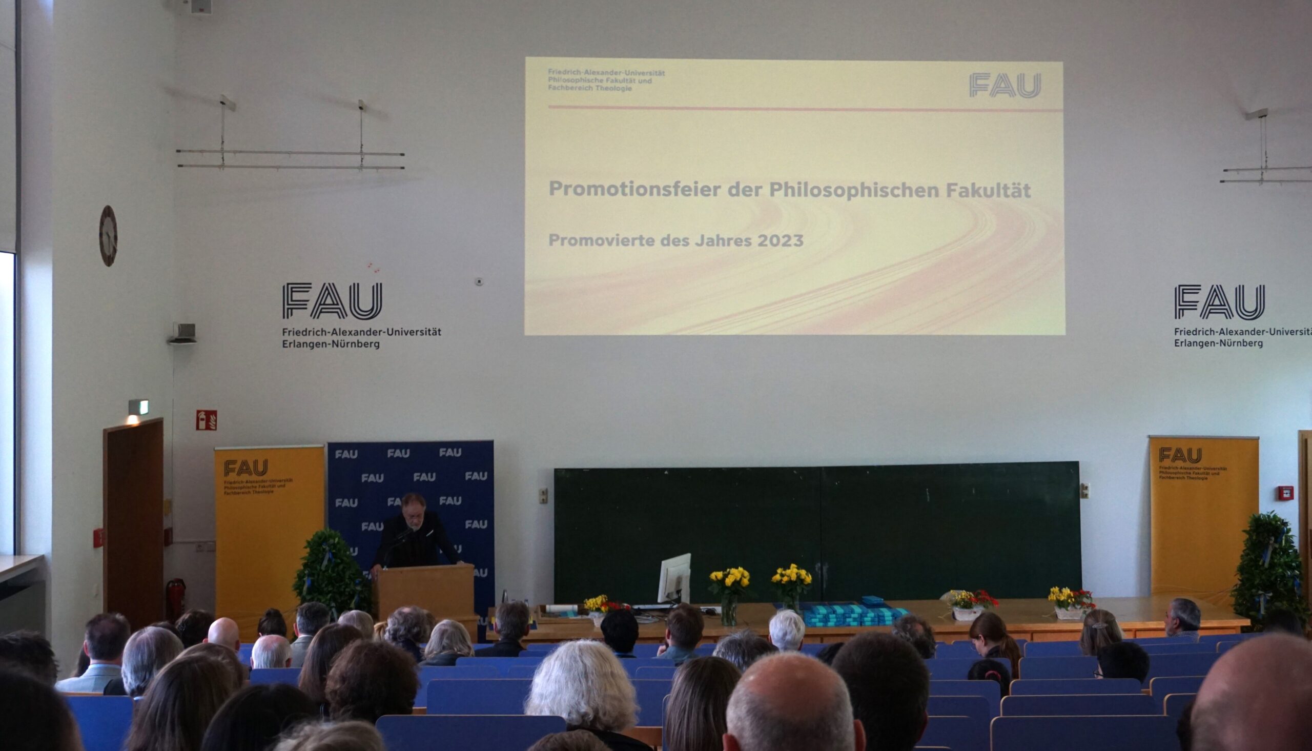Am 10. Mai 2024 hat die Philosophische Fakultät und Fachbereich Theologie feierlich ihre Promovierten des Jahres 2024 geehrt. Nach der Begrüßung durch Prof. Dr. Kay Kirchmann, Dekan der Fakultät, Prof. Dr. Peter Dabrock, Fachbereichssprecher Theologie, und Prof. Dr. Thomas Demmelhuber, Vorsitzender des Promotionsausschusses, wurden die anwesenden Promovierten und die Titel ihrer Dissertationen kurz einzeln vorgestellt.