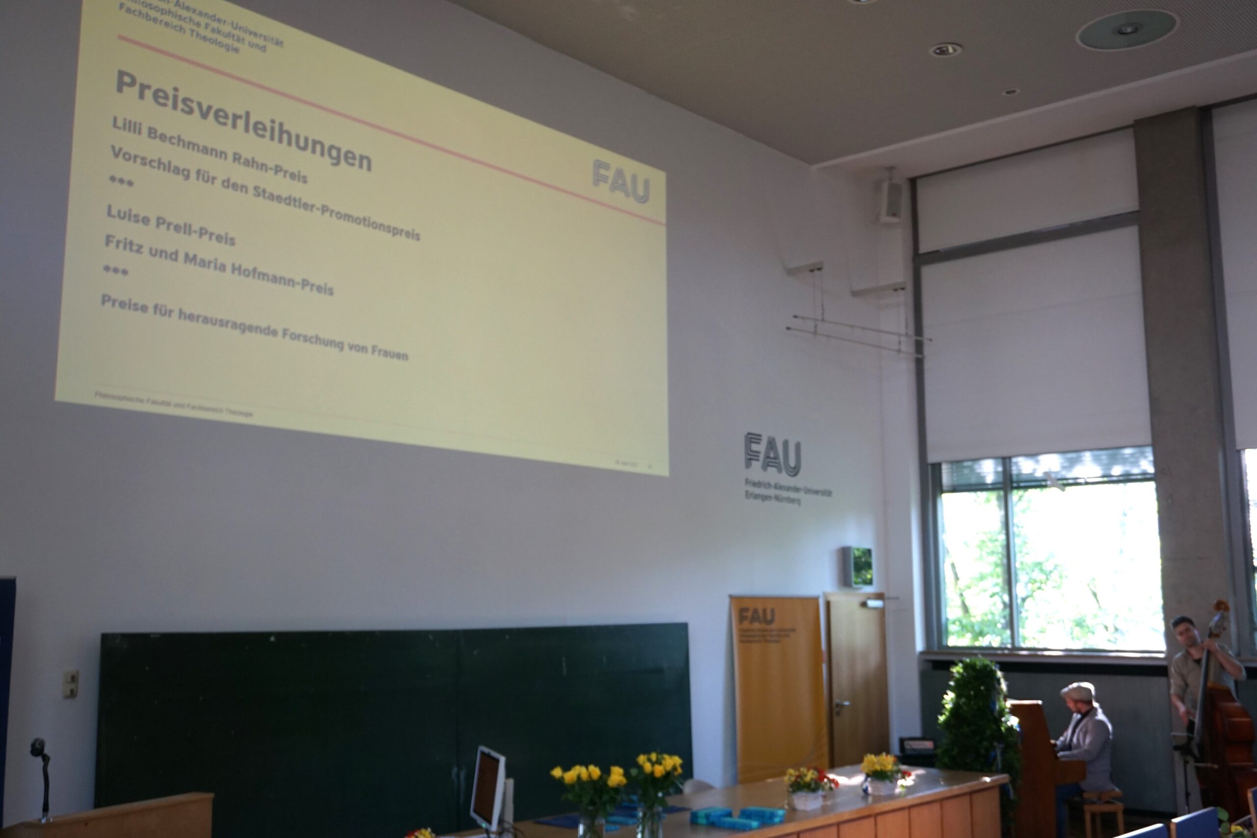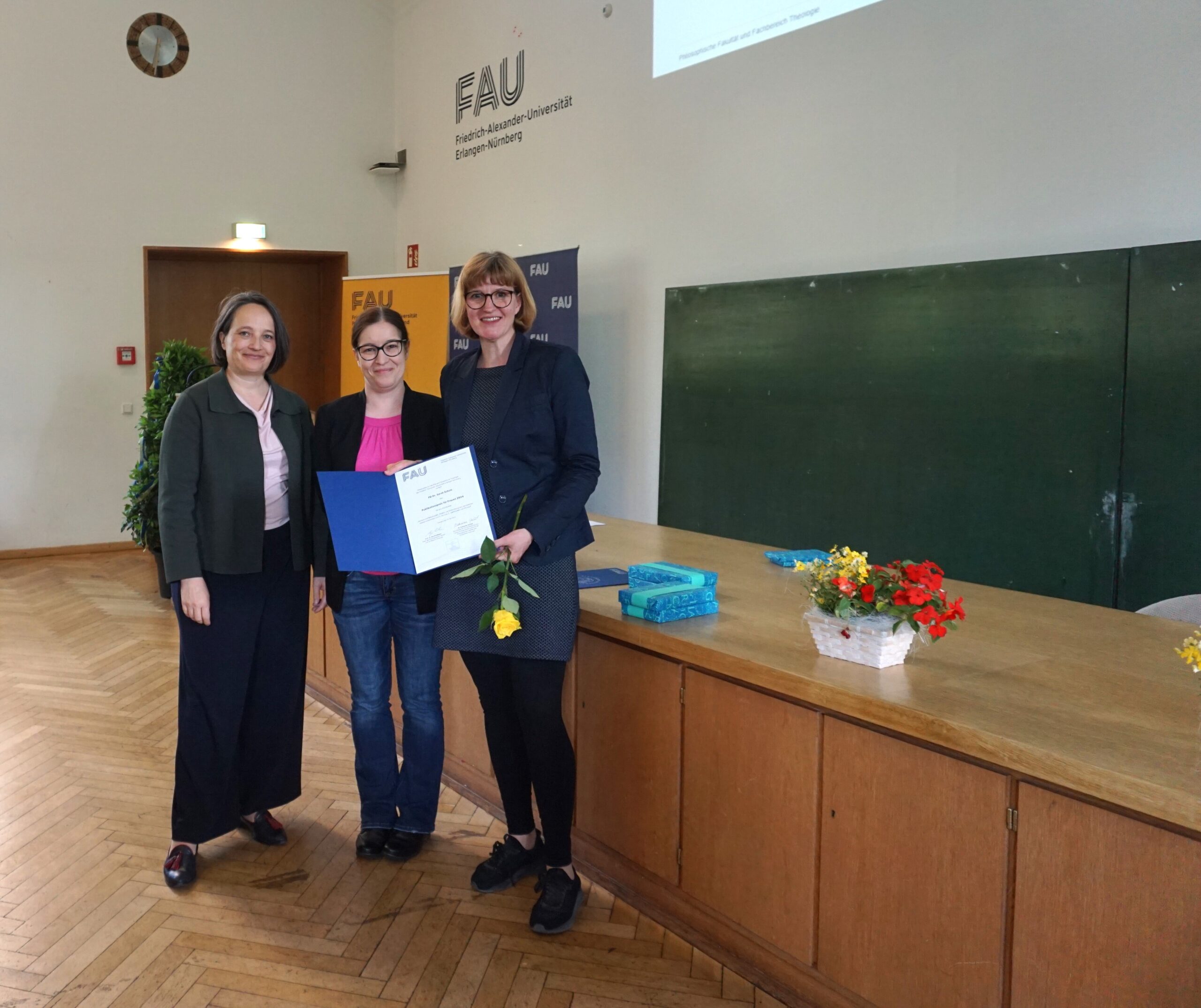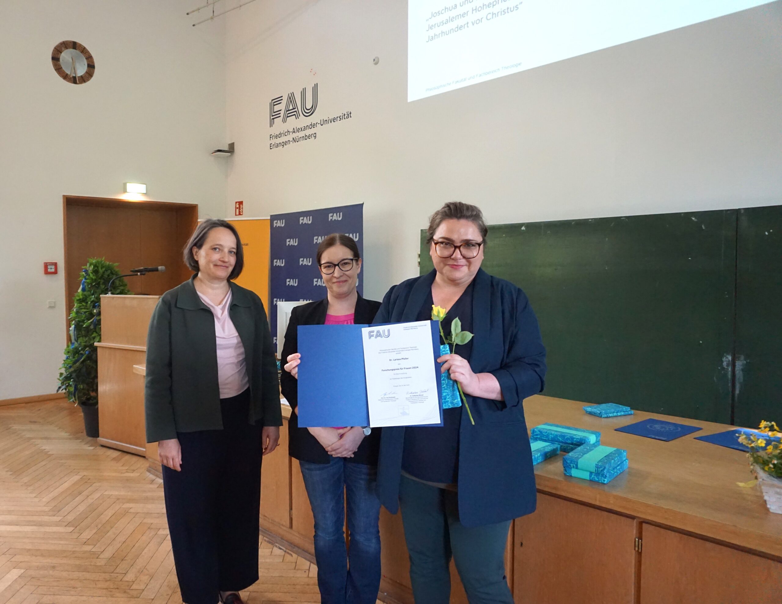 Die Fakultätsfrauenbeauftragten Dr. Katharina Gerund und Dr. Cleophea Ferrari überreichten die Preise für herausragende Forschung von Frauen in den Geistes- und Sozialwissenschaften. 2024 wurden zwei Publikationspreise an PD Dr. Sarah Schulz (Theologie) und Dr. Janina Stürner-Siovitz (Institut für Politische Wissenschaft) verliehen. Dr. Larissa Pfaller wurde mit dem Forschungspreis ausgezeichnet.