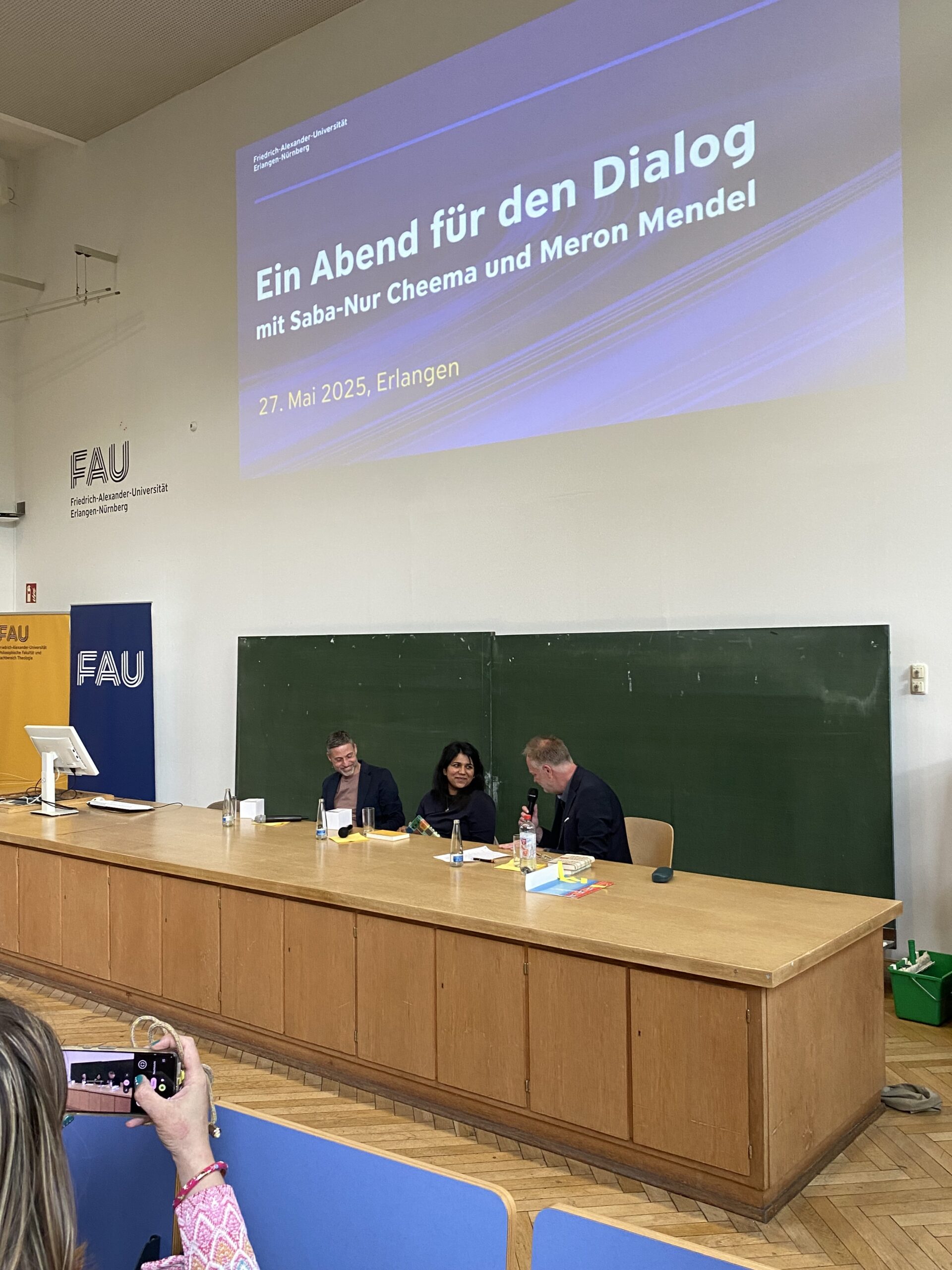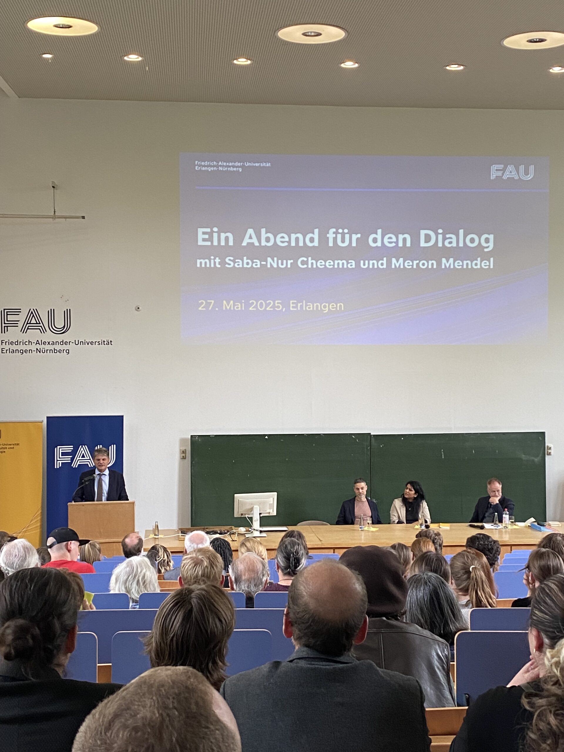 Prof. Dr. Joachim Hornegger, Präsident der FAU: „Es war mir eine große Freude und Ehre, Saba-Nur Cheema und Prof. Dr. Meron Mendel als Gäste an der FAU begrüßen zu dürfen. Ihre Klarheit, Offenheit und ihr tiefes Engagement für ein friedliches Zusammenleben haben einen bleibenden Eindruck hinterlassen. Mit ihrem Buch „Muslimisch-jüdisches Abendbrot“ zeigen sie, dass ein sinnvoller Dialog möglich ist – auch bei unterschiedlichen Weltanschauungen.“