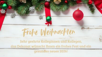 Das Dekanat wünscht Ihnen und Ihren Familien ein frohes Weihnachtsfest und besinnliche Feiertage. Wir bedanken uns herzlich für die angenehme Zusammenarbeit und wünschen Ihnen für das Jahr 2026 Gesundheit, Erfolg und einen guten Start.