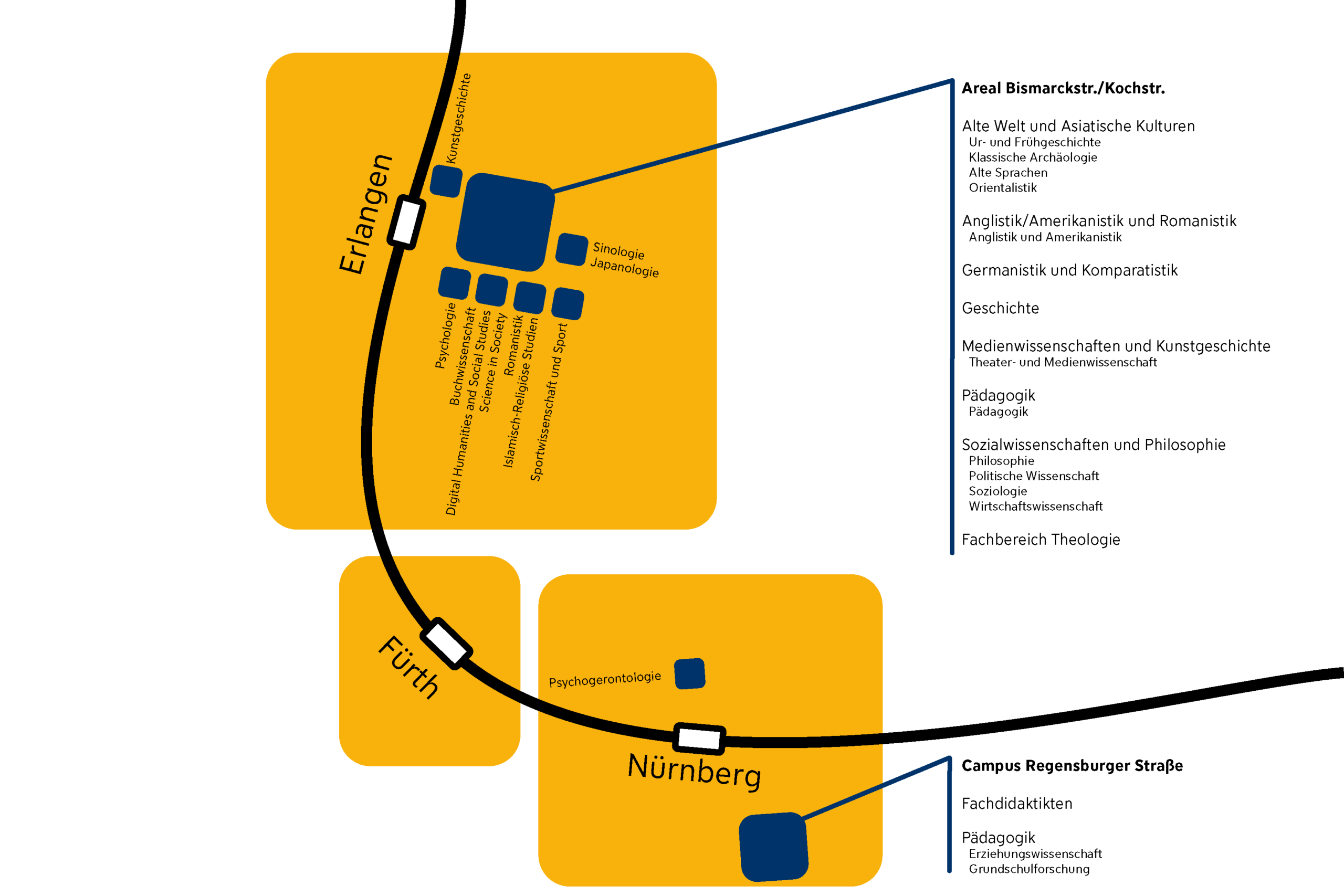Die Fakultät ist besonders geprägt von ihrer fachlichen Vielfalt, die sich in den 13 Departments zeigt, die z.T. in Institute untergliedert sind. Die Einrichtungen der Fakultät verteilen sich auf Standorte in Erlangen und Nürnberg.