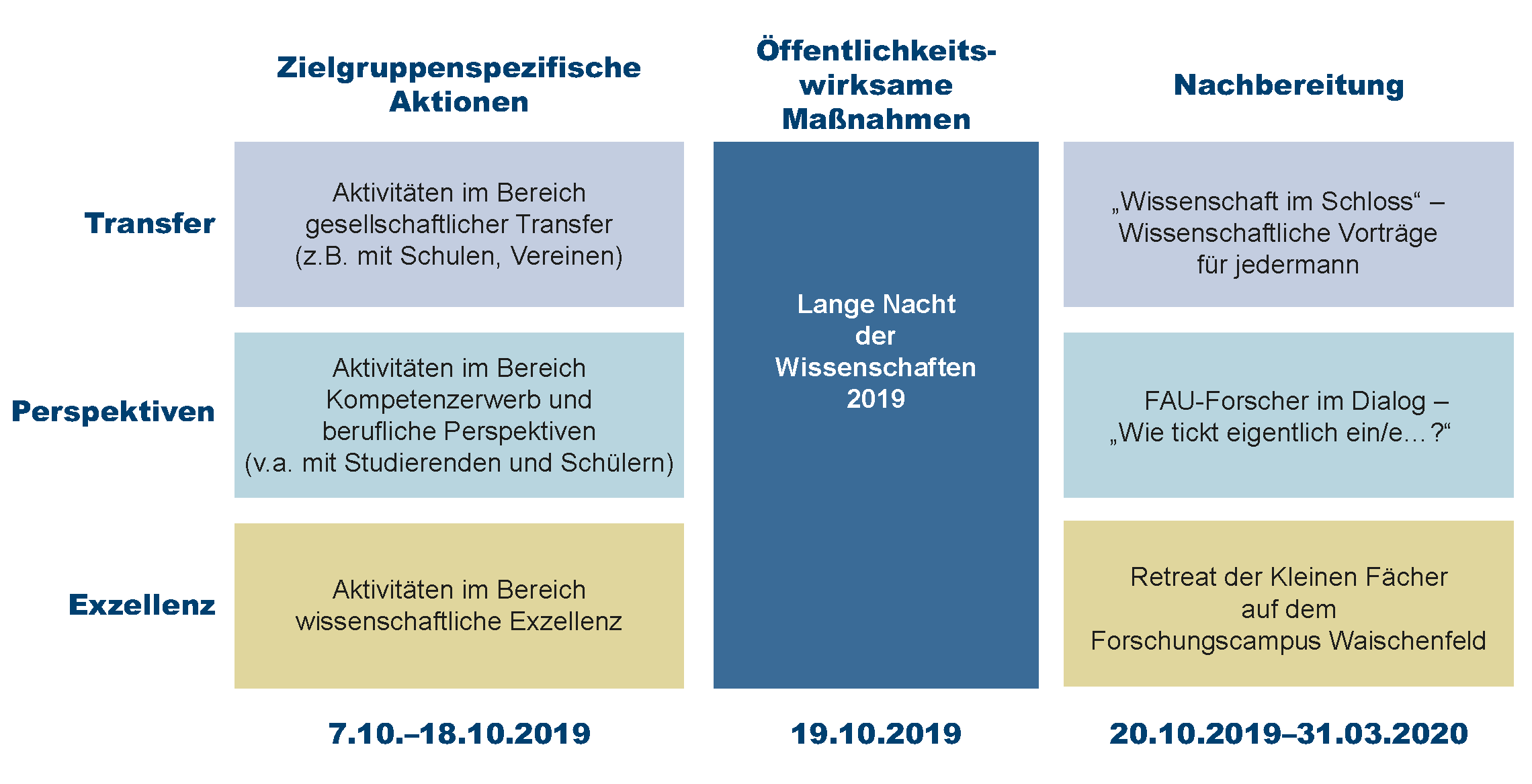 Die Aktionen zu den Kleinen Fächern an der FAU erstrecken sich über mehrere Wochen im Wintersemester 19/20 und lassen sich in drei zeitlich aufeinander abgestimmte Maßnahmenpakete (zielgruppenspezifische Aktionen, öffentlichkeitswirksame Maßnahmen, wissenschaftsinterne Nachbereitung) unterteilen.